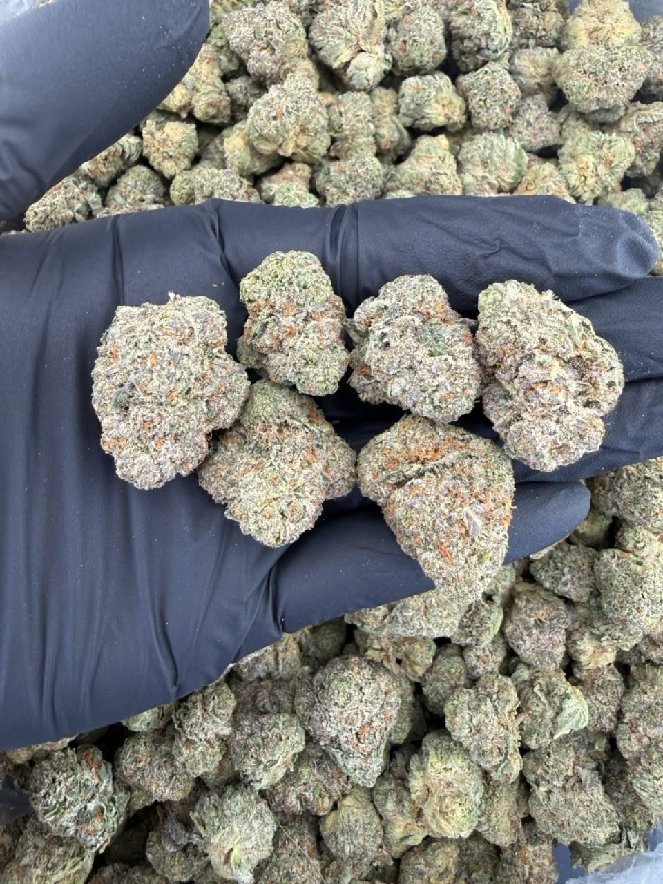 Heavy white trichome frost (“icy” coating) ❄️